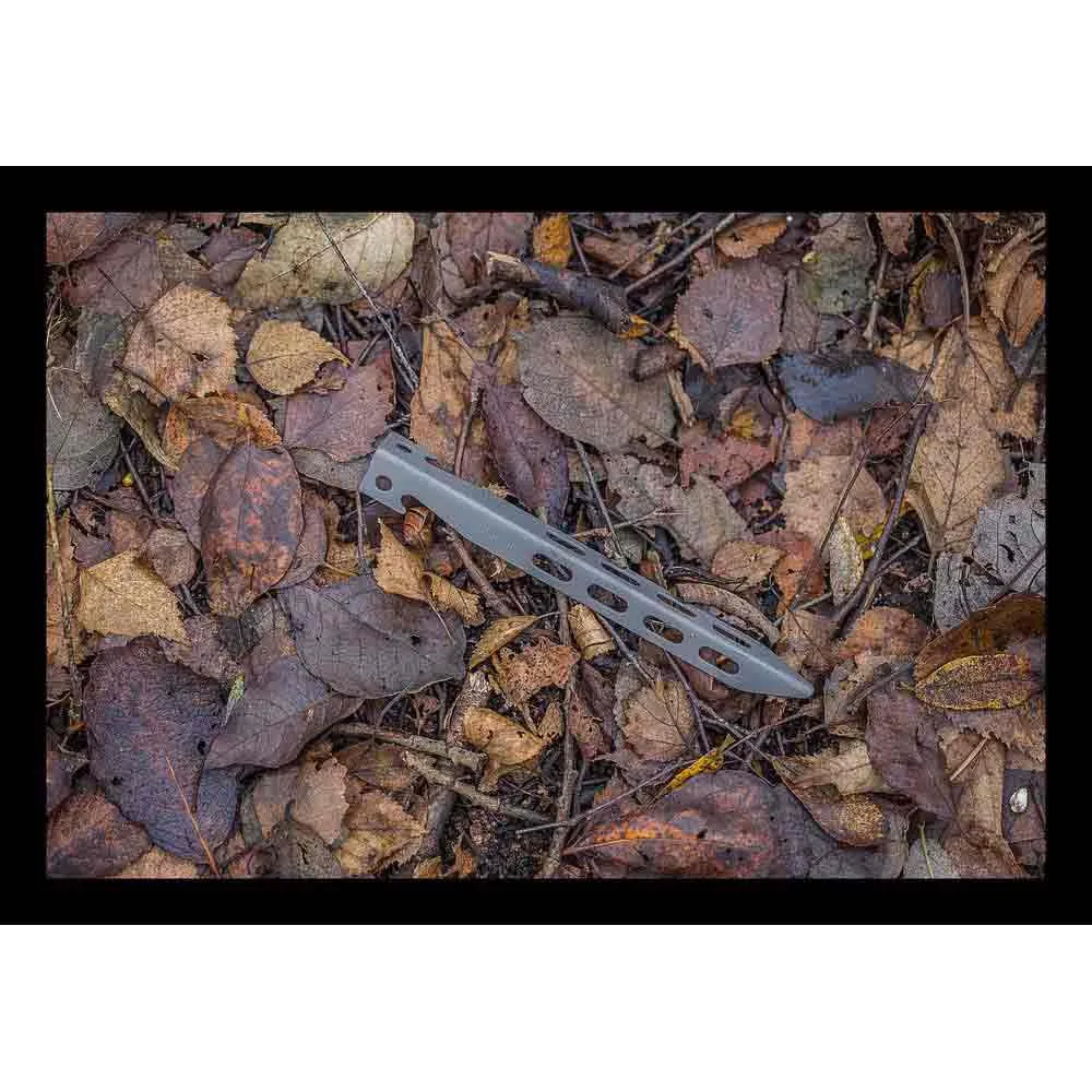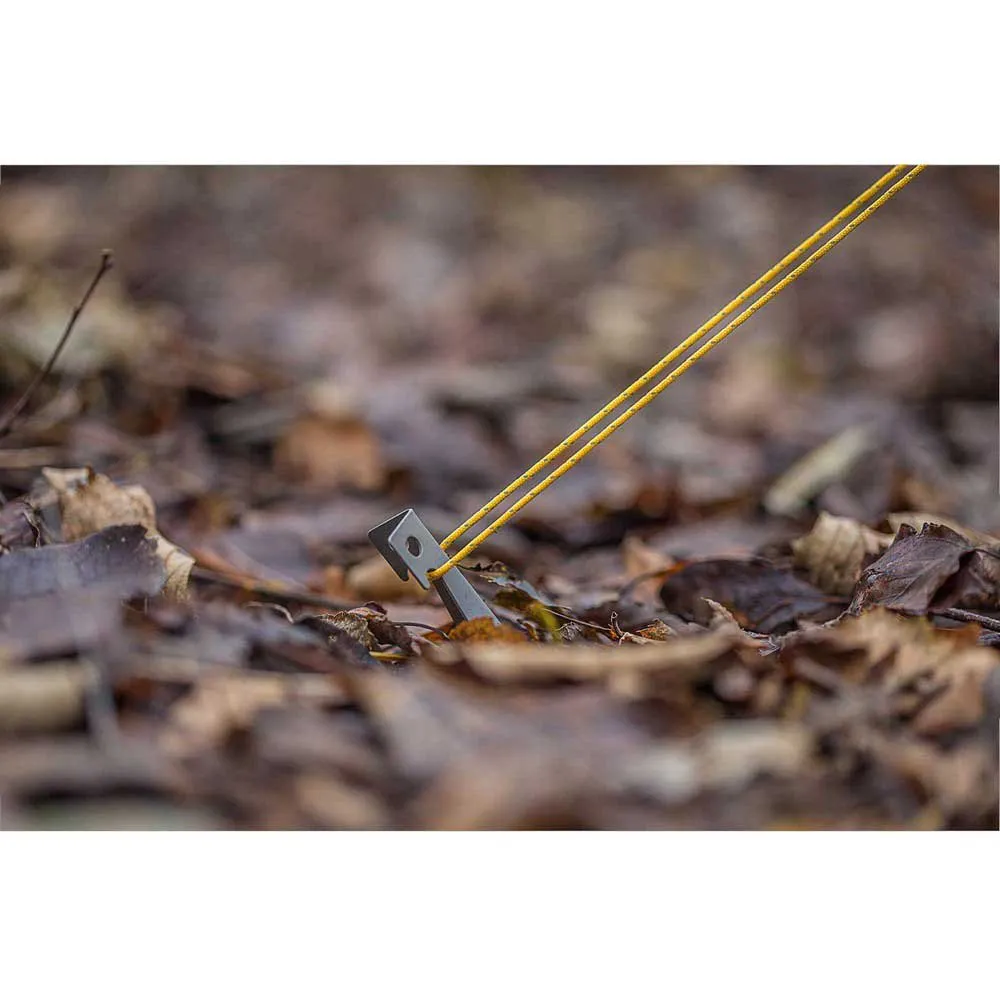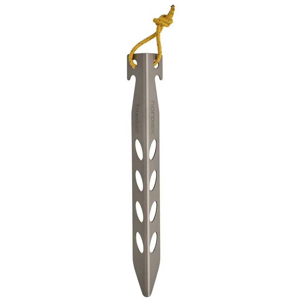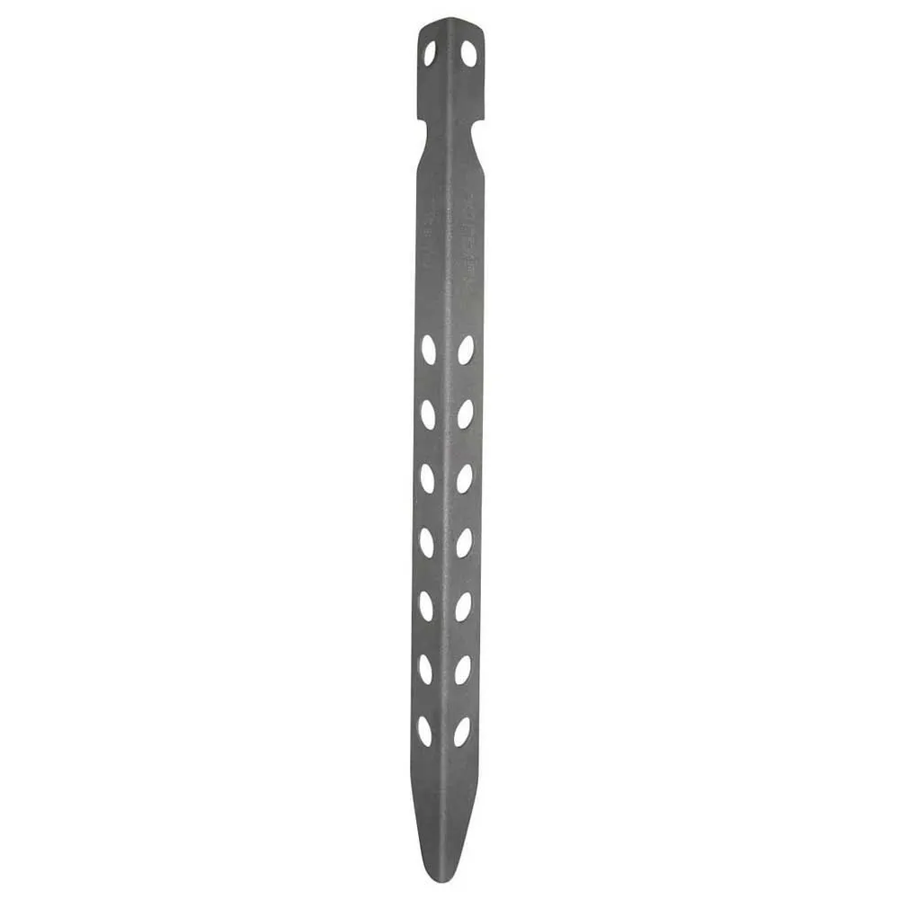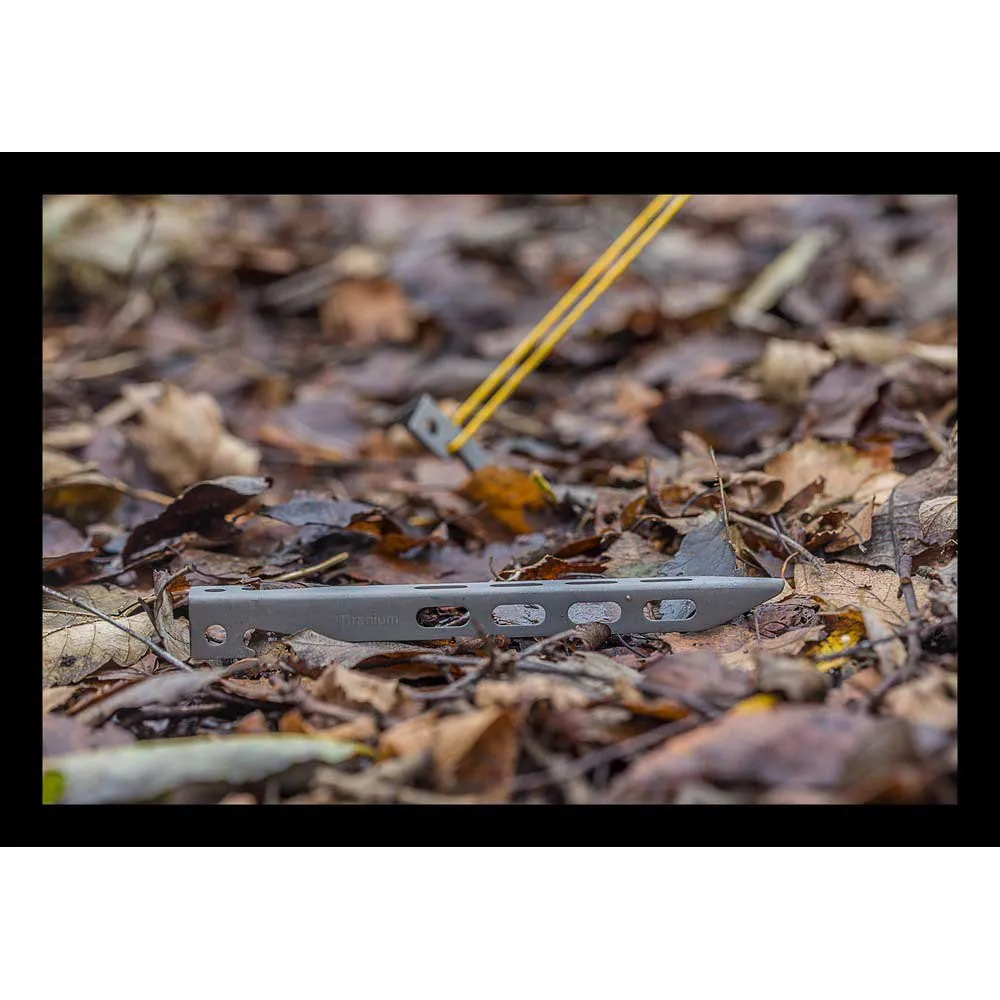 Very light titanium peg with an extremely strong hold. The 15g titanium V-peg is extremely durable and designed to offer maximum strength at the lowest possible weight. Designed in a classic V-shape, but trimmed with added holes to save weight, it offers a firm grip, making it possible to withstand even very high tension and stormy weather. The choice of titanium and the wide V-shaped design adds extra strength and an even stronger grip to the peg. The V-shape combined with the thin titanium surface allows it to cut through smaller roots, making it especially great for pegging in areas with much vegetation, like woods and forests.
