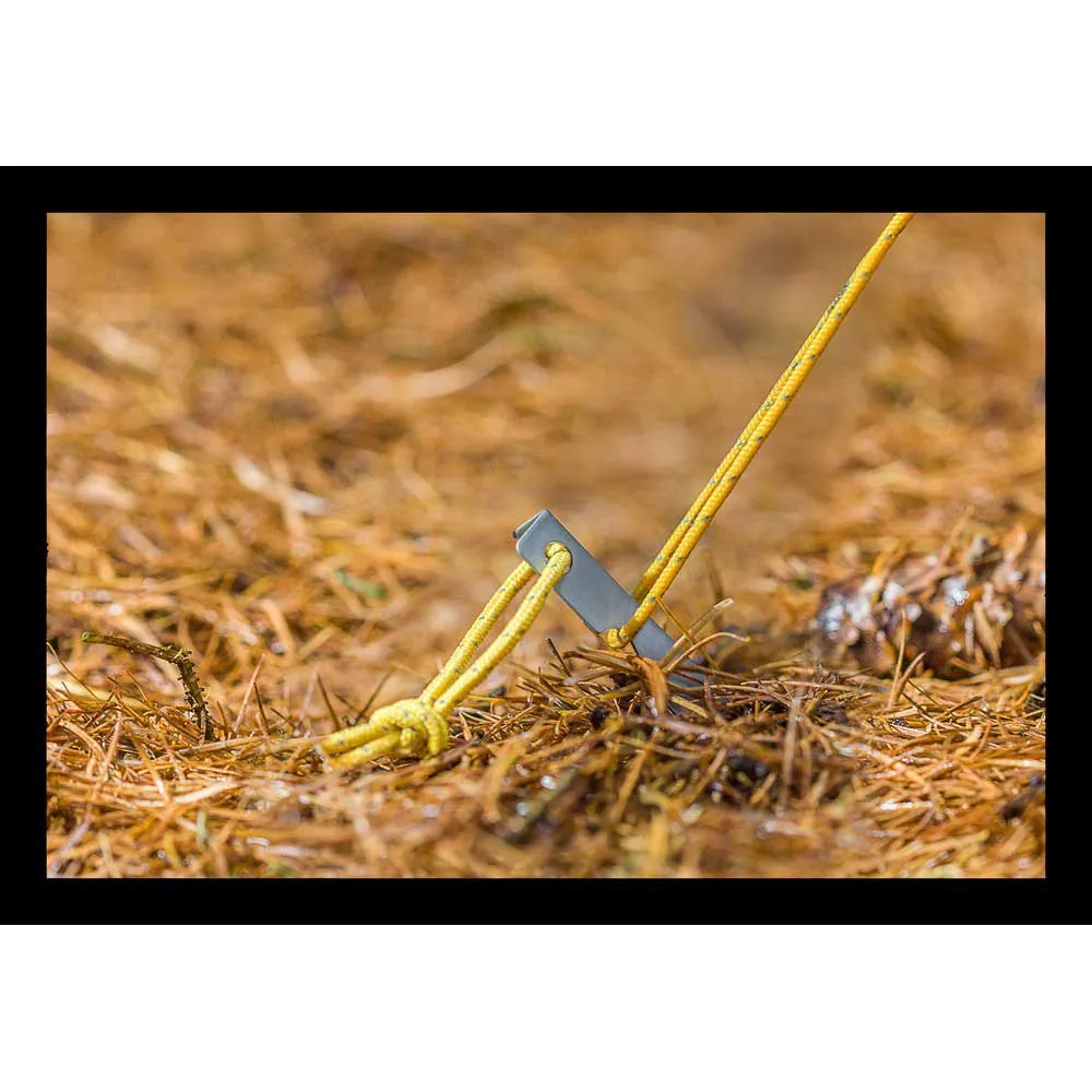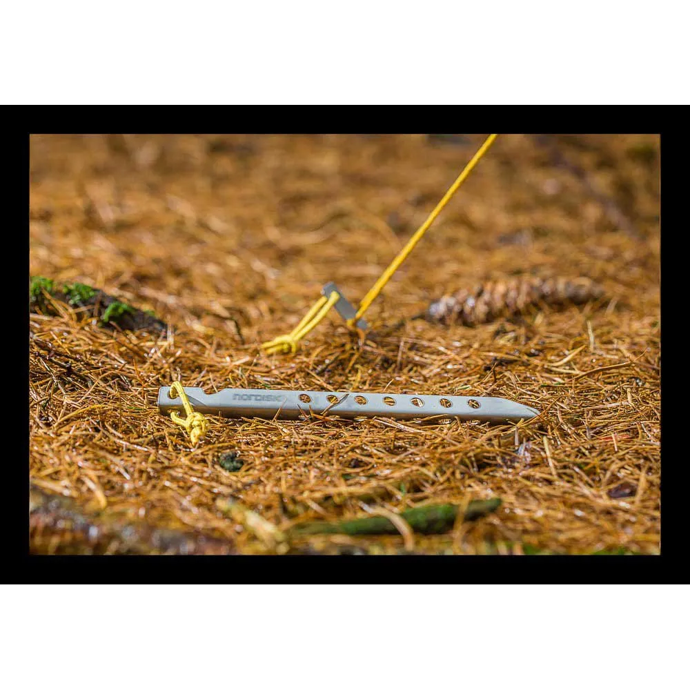 Ultra-light titanium peg with a strong grip for high tension. The 9g titanium V-peg is both a very light and strong peg. It is designed in a classic V-shape, but trimmed with added holes for the lowest possible weight. Titanium construction offers the highest strength to weight performance while the V-shape combined with the thin titanium surface allows the peg to actually cut through smaller roots, making it especially optimal for pegging in areas with much vegetation, like woods and forests. The titanium V-peg offers a firm grip, making it possible to withstand even very high tension and stormy weather.