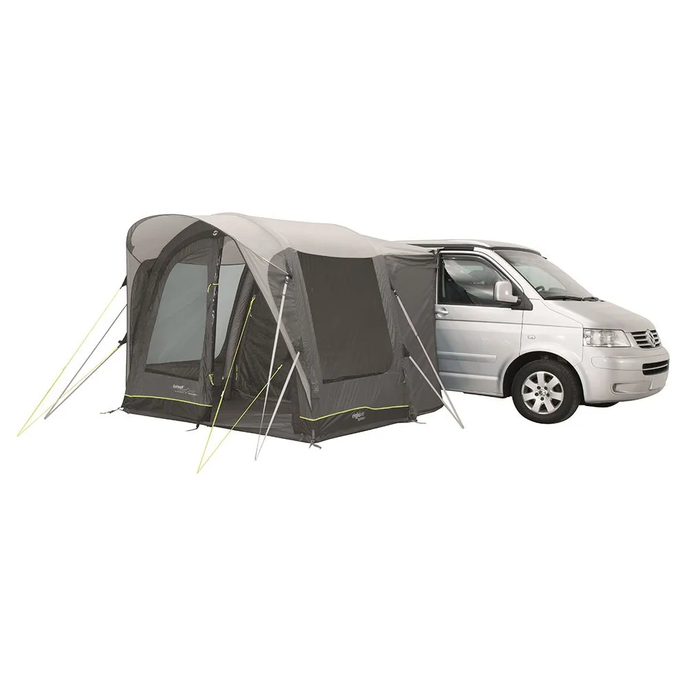 The tunnel tent design of the Newburg 160 Air drive-away awning has two opposing doors in the Link Access Zone, with buckled webbing for height adjustment.